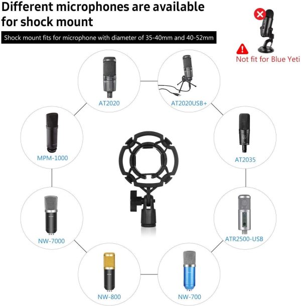 - Shock Mount: Please noted the shock mount is not fit for Blue Yeti.It is made of high-quality material and can protect the microphone all-around with high rubber rope design which makes the microphone more convenient to install and prevent it from falling. The shock mount has a hole diameter of 52mm, which is slightly larger than others.