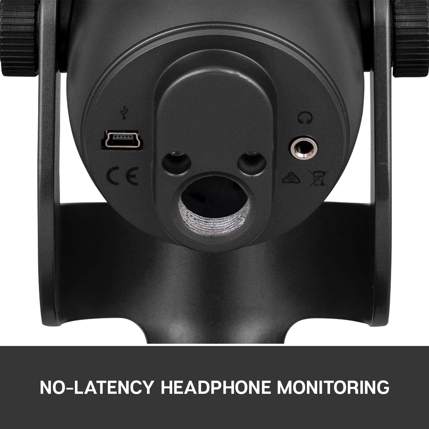 The microphone comes equipped with a 3.5-millimeter headphone jack that allows you to listen to what you're recording in real-time, without latency delays—that means no more hearing a note 3 seconds after you played it. You can adjust the volume of your headphones using the control on the front of the microphone.