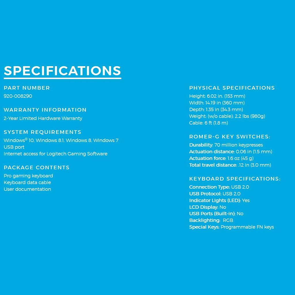 Pro Gaming Keyboard features Logitech G LIGHTSYNC technology—next-gen RGB lighting driven by actions in over 300 top games. Customize colors + effects across LIGHTSYNC mice, keyboards, headsets and speakers for new gaming intensity.