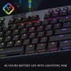 - Enjoy 40 hours of game time on a single charge. Low battery warnings at 15% on the keyboard battery LED and via pop-up notification in the Logitech G HUB software. Quickly recharges in 3 hours.