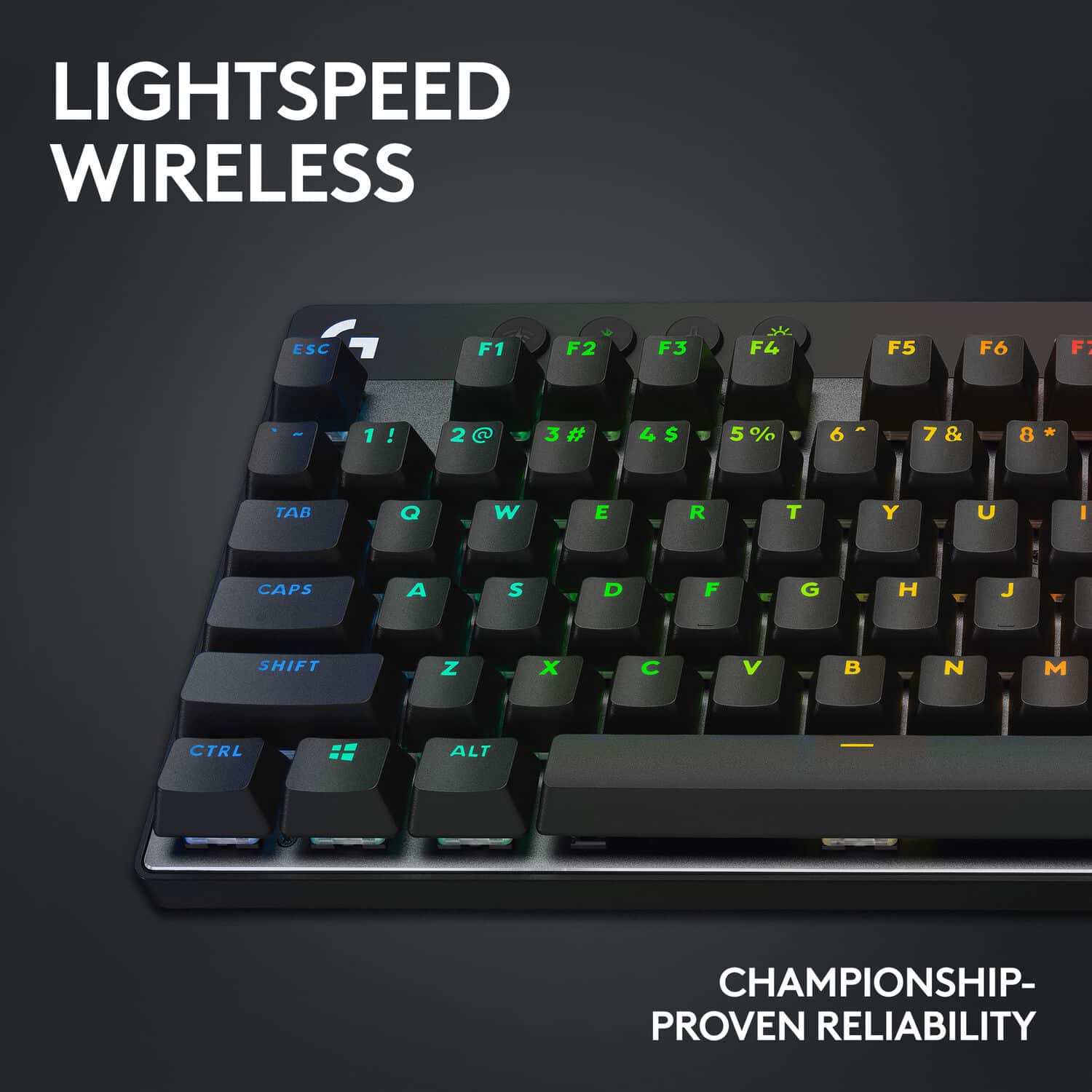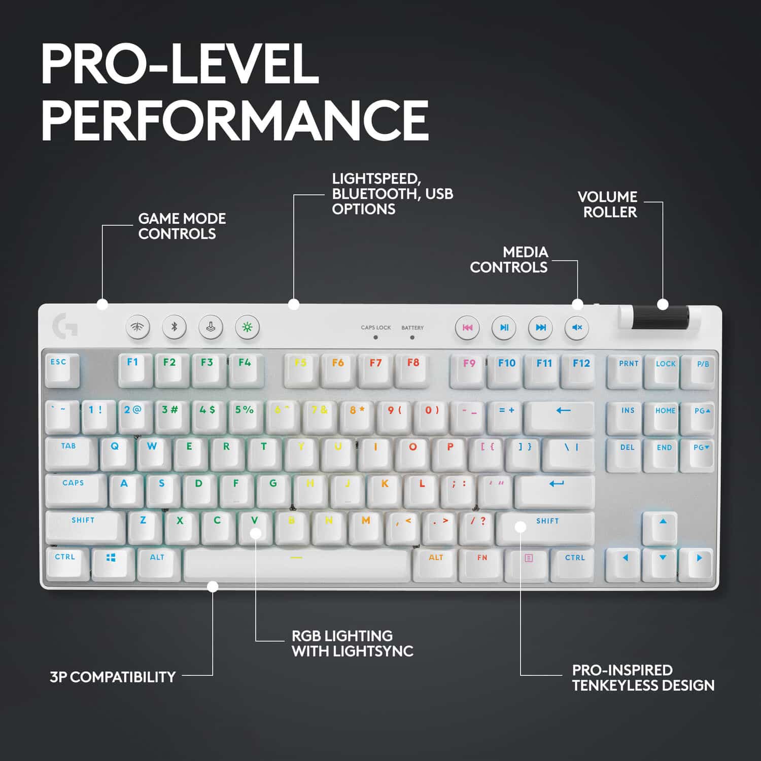 Designed for pros to win championships, with game mode control, dual-shot PBT keycaps, standard keyboard layouts for 3P compatibility, and LIGHTSPEED, Bluetooth, and USB connectivity options.