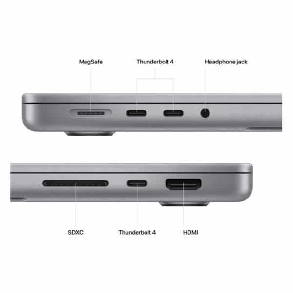 | Ports | SDXC card slot HDMI port 3.5 mm headphone jack MagSafe 3 port Three Thunderbolt 4 (USB-C) ports with support for: Charging DisplayPort Thunderbolt 4 (up to 40Gb/s) USB 4 (up to 40Gb/s) |