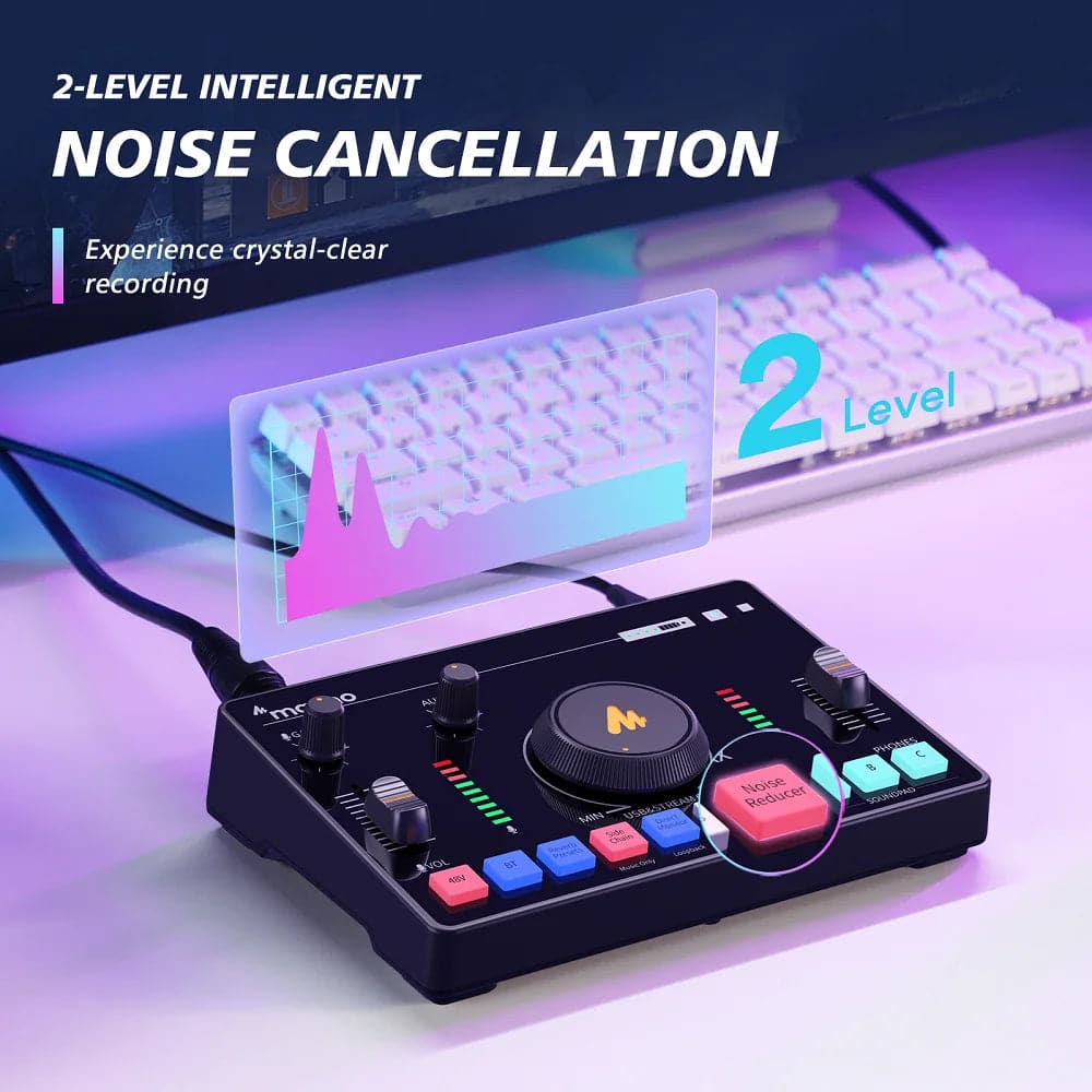 Easily use the AUX interface to play background music from your phone, and record directly to phones via the STREAM OUT output, 2 level noise reduction enables you to reduce the surrounding noise and immersive live broadcast atmosphere.