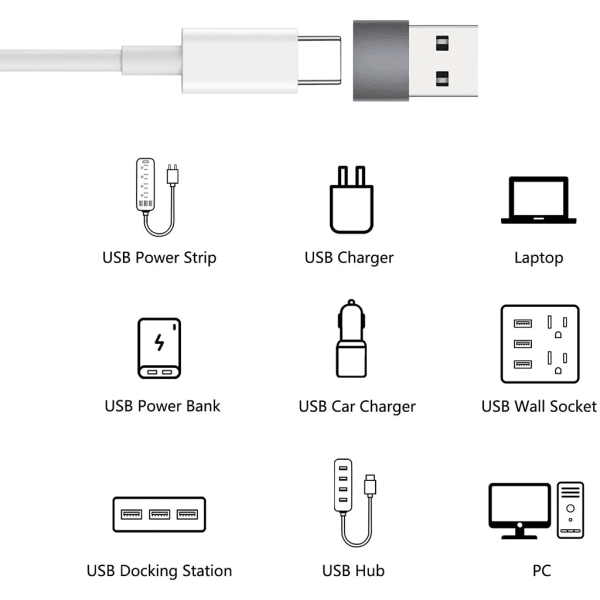 Compatible with a wall charger, docking station, power bank, car charger with USB-A port.
