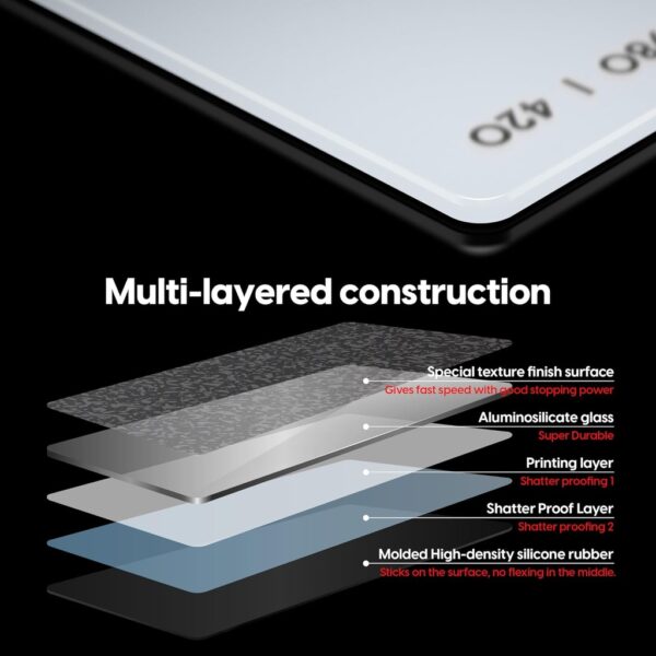 The ultimate in performance and durability, with a top layer of super strong aluminosilicate glass and a unique surface pattern for fast glide and good stopping, and a bottom layer of high-density silicone for a secure grip.