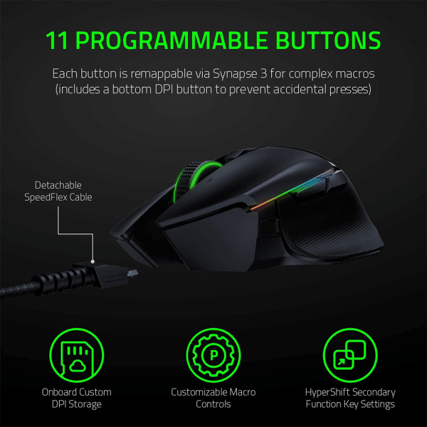 • 11 Programmable Buttons: Allows for reconfiguration and assignment of complex macro functions through Razer Synapse 3