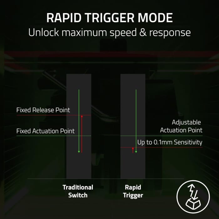 - FAST-FEED TRIGGER – Compared to traditional mechanical or optical keyboards, you can make even faster and more precise inputs. You can reset the key function at the slightest lift of the finger and take advantage of a speed advantage that can make a big difference, especially in competitive FPS