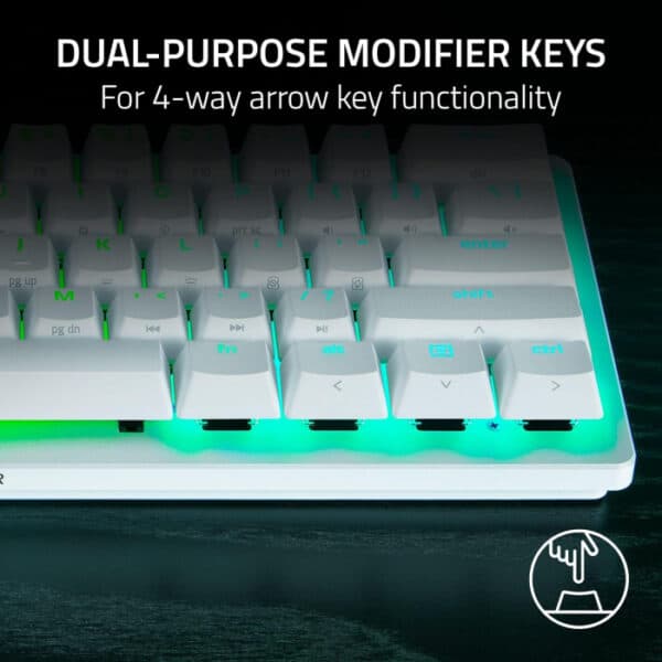 - MULTI-PURPOSE MODIFIER KEYS – The modifier keys at the bottom right work like arrow keys when tapped, allowing you to navigate as comfortably as with a larger keyboard