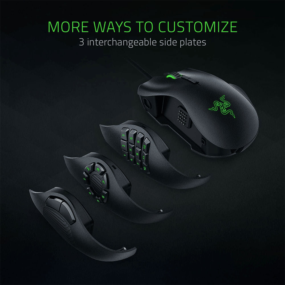 - 4 Interchangeable Side Plates With different button configurations: With interchangeable side plates for 2, 7 and 12-button configurations, transmute your mouse to suit your gameplay. Each button is designed to stand out so you’ll never misclick, providing tactile and audible feedback so you’ll be assured of every actuation.