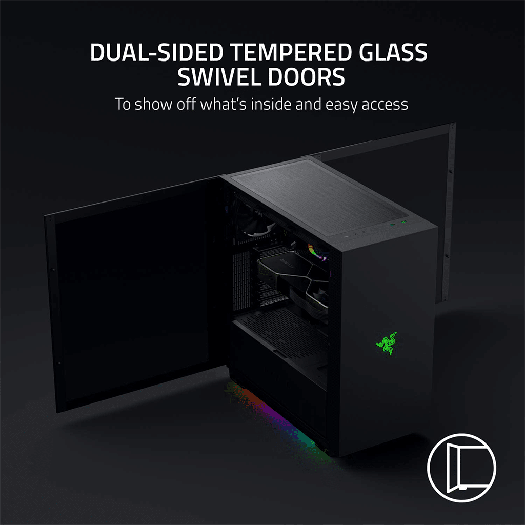 Show off the true craftsmanship of your rig and performance of its Chroma-enabled hardware, as you swap out parts easily with rear-hinged doors that swing outwards and open without the need for tools.