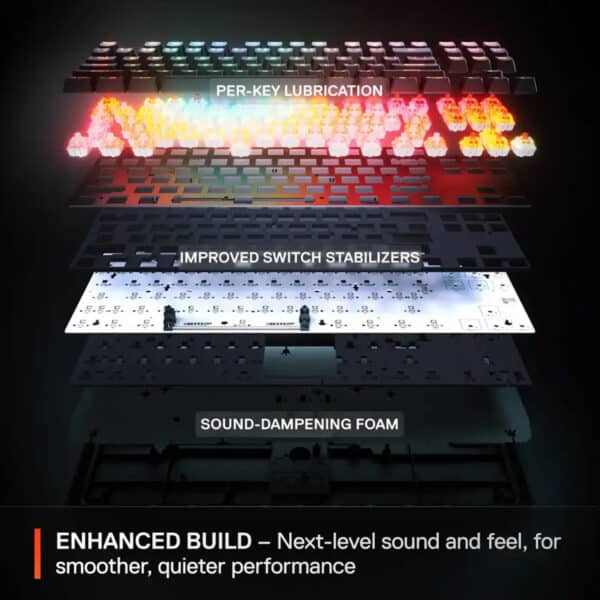 RAPID TAPPrioritizes the last key press in a selected pair for faster input and improved aim. Enhances responsiveness for counter-strafing, peeking, crouch jumping, or slide canceling. (Latest GG update required)GAME-READY PRESETSGain a competitive edge in your favorite game with just a few clicks using GG QuickSet's game-ready keyboard settings.REDUCED LATENCYRapid Trigger and Rapid Tap register keypresses faster for more responsive game play and improved aim.PROTECTION MODEA SteelSeries exclusive feature — protect your keypresses by reducing the sensitivity of surrounding keys when the intended key is pressed, preventing accidental inputs.OLED SMART DISPLAYYour digital command center for all your settings without taking you out of the game.80% TKL FORM FACTORFull-size functionality. Premium aluminum top plate. Detachable USB-C. |