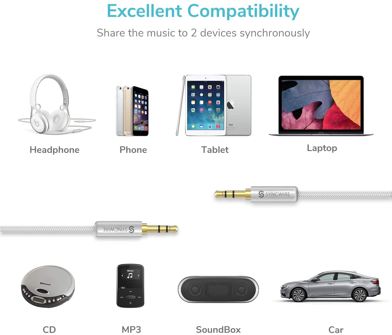 Syncwire 3.5mm audio cable is compatible with iPhone, iPod, iPad, other smartphones, headphones, tablets, laptops, Walkman, Echo Dot (2nd Generation) and all other audio-playing devices with a 3.5mm aux port.