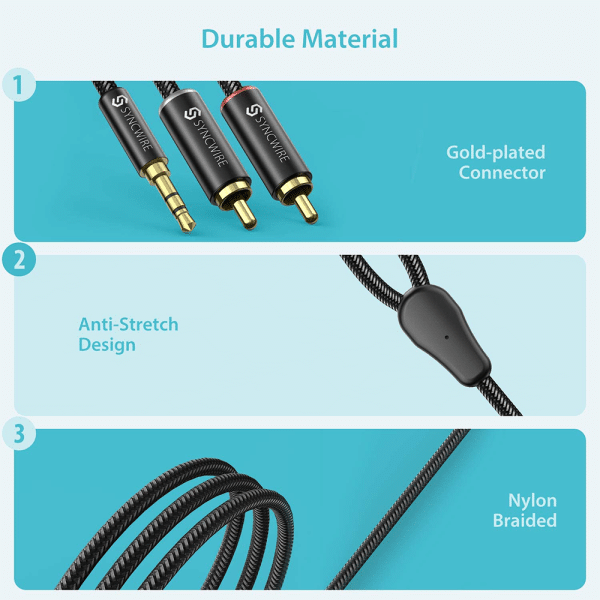 - High quality (HD) stereo sound – The Syncwire 3.5 mm to 2 RCA adapter cable has a gold-plated finish to avoid surface oxidation. The stable performance also allows clear audio transmission, without noise. The 2-channel connection supports better stereo surround sound.