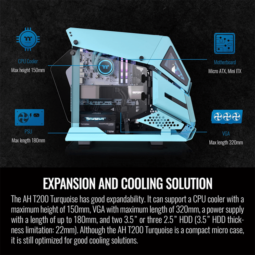 | Special Features | The AH T200 helicopter-inspired open frame micro chassis comes in special color edition- Turquoise. It features two 4mm tempered glass panels on the left and right sides and can support motherboards up to a Micro ATX. |