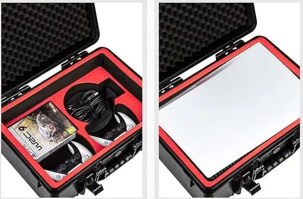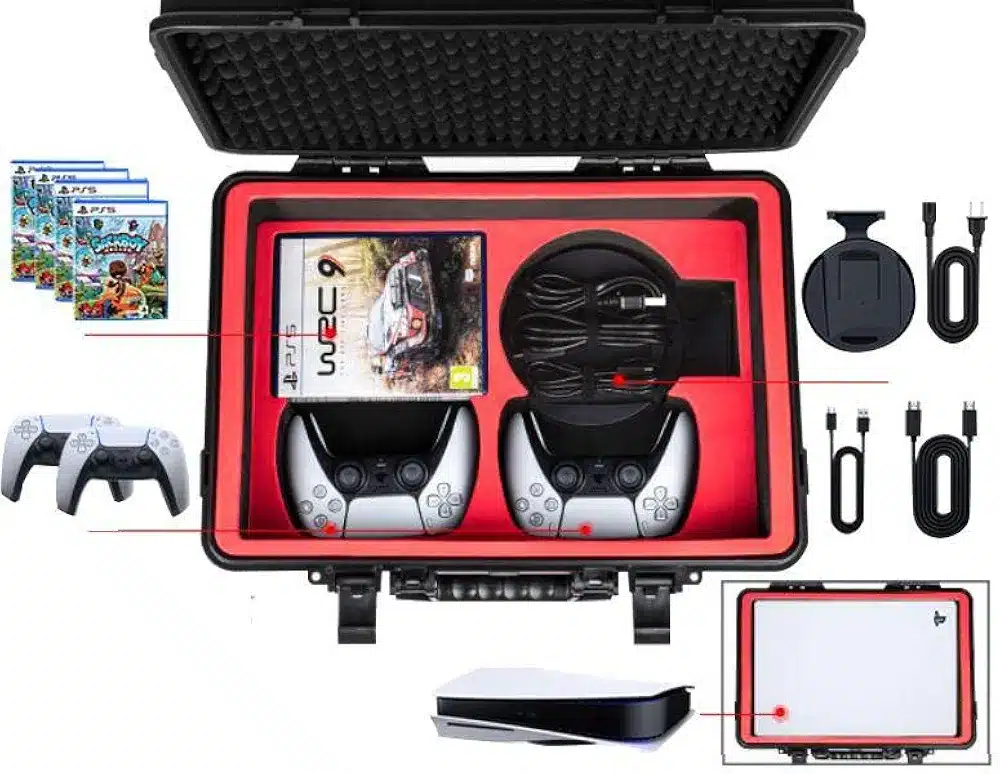 • All-in-one: PS5 Carrying Case for PlayStation 5 With customized-cut premium EVA foam space layout. Compatible with PS5 console and other accessories. PS5 Hard case can hold: 1* PlayStation 5 Console, 2* Controllers, Headset, Games, Cables, PS5 Stand also other accessories.