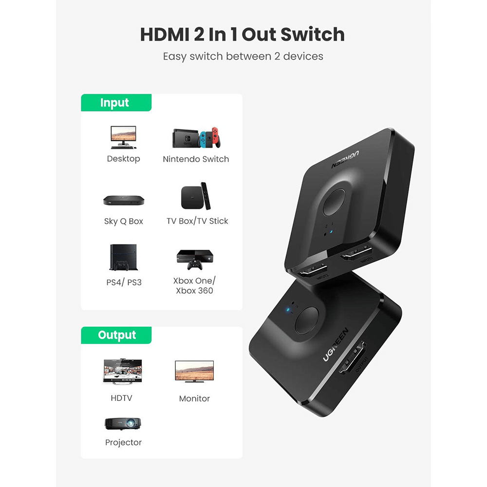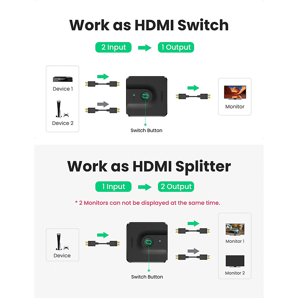 UGREEN HDMI switch offers 2 HDMI inputs for your devices to connect with 1 HDMI Display monitor, with the single button, easy switch between the 2 devices, saves the trouble to plug and unplug;
