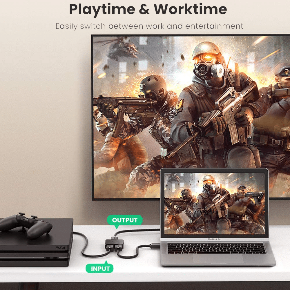 - UGREEN HDMI SPLITTER 2 IN 1 OUT HDMI switch offers easy solution for you to connect 2 devices such as PS4, XBOX, PC with your single port HDTV for video output, saves the plug and re-plug, easy switch between the 2 devices with one button, hassle-free between the work time and play time;