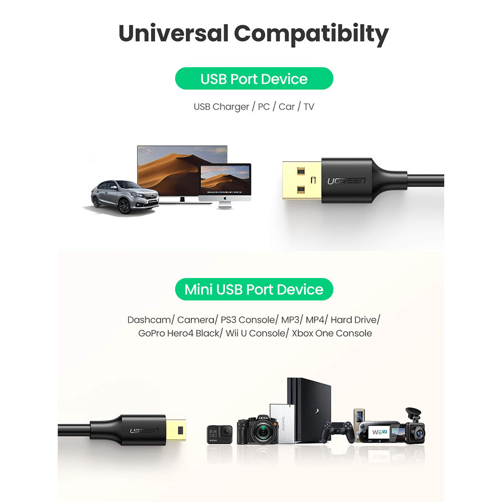 - UGREEN mini usb cable connects your USB-ready computer or USB hub to a digital camera or other portable device with a mini B 5-pin connector, such as an MP3 player , PDAs, game controller.