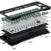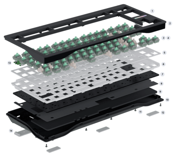 1. LED bar 2. PCR ABS Plastic top case 3. Lekker V2 L60 switches 4. Screw-in stabilizer 5. PC switch plate 6. Silicone sandwich pad & gasket-mount 7. PCBA 8. PET film "tape mod" 9. EPDM foam 10. PCR ABS Plastic bottom case 11. M2x5 Screws 12. Silicone feet 13. USB daughter board 14. Interchangeable silicone angled feet